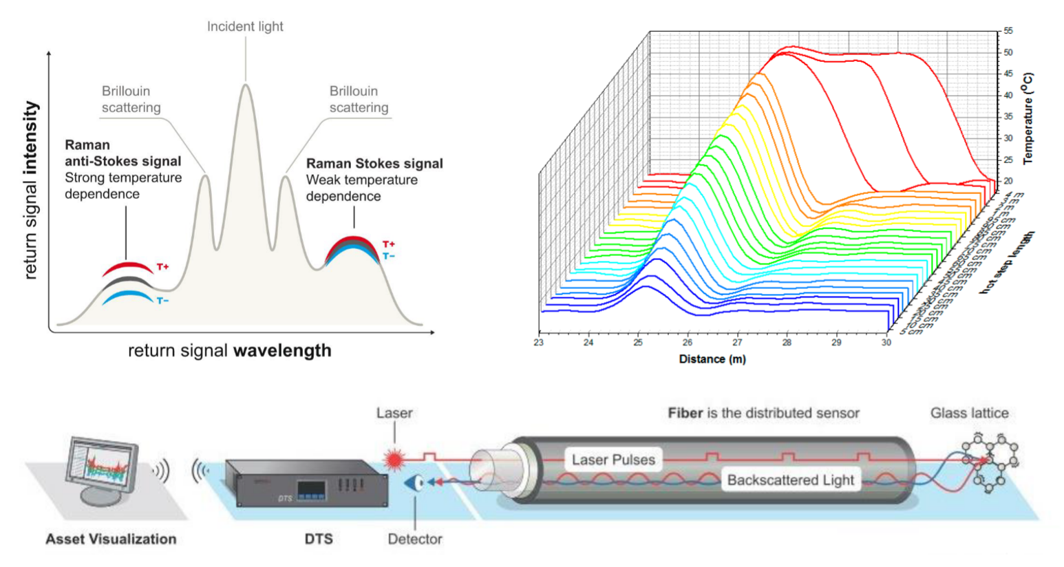 线型光纤感温火灾探测系统(以下简称为DTS)是由线型光纤感温火灾探测器、感温光缆、测温软件以及附属设备构成。基于拉曼散射和激光雷达技术,探测器可以实时采集敷设于探测区域的光纤光缆沿线的温度数据,准确定位温度异常位置。