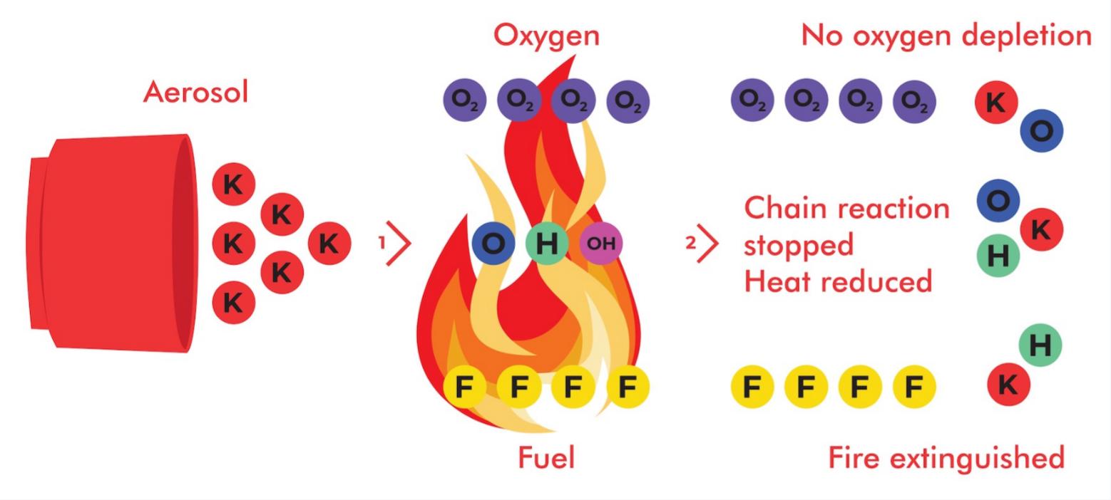 热气溶胶产气剂是一种由氧化剂、还原剂、燃烧速度控制剂和粘合剂组成的固体化学混合物。通过电(热)启动后,其自身发生氧化还原反应形成大量凝集型灭火气溶胶,气溶胶中的金属盐微粒在高温下吸收大量的热,从而降低火焰温度,抑制燃烧反应。同时在热作用下,灭火气溶胶气体中的气化金属离子、阳离子可以与燃烧中的活性基团发生亲和反应,反复大量消耗活性基团,减少燃烧自由基,并高效吸收火焰中的燃烧自由基,达到化学抑制作用。灭火气溶胶中的N2、CO2可以降低燃烧中氧浓度,通过物理、化学等多种灭火机理共同作用达到灭火目的。而灭火气体中包裹着固体颗粒形成的气溶胶,可以长时间悬浮、散布到各个角落,实现全淹没的方式高效灭火。